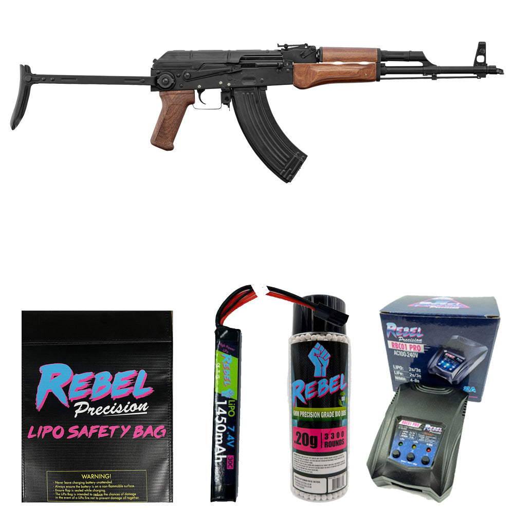 Metal body model of the famous AKM in folding stock version, with a real wood handguard. Originally equipped with a side rail for mounting AK optics.