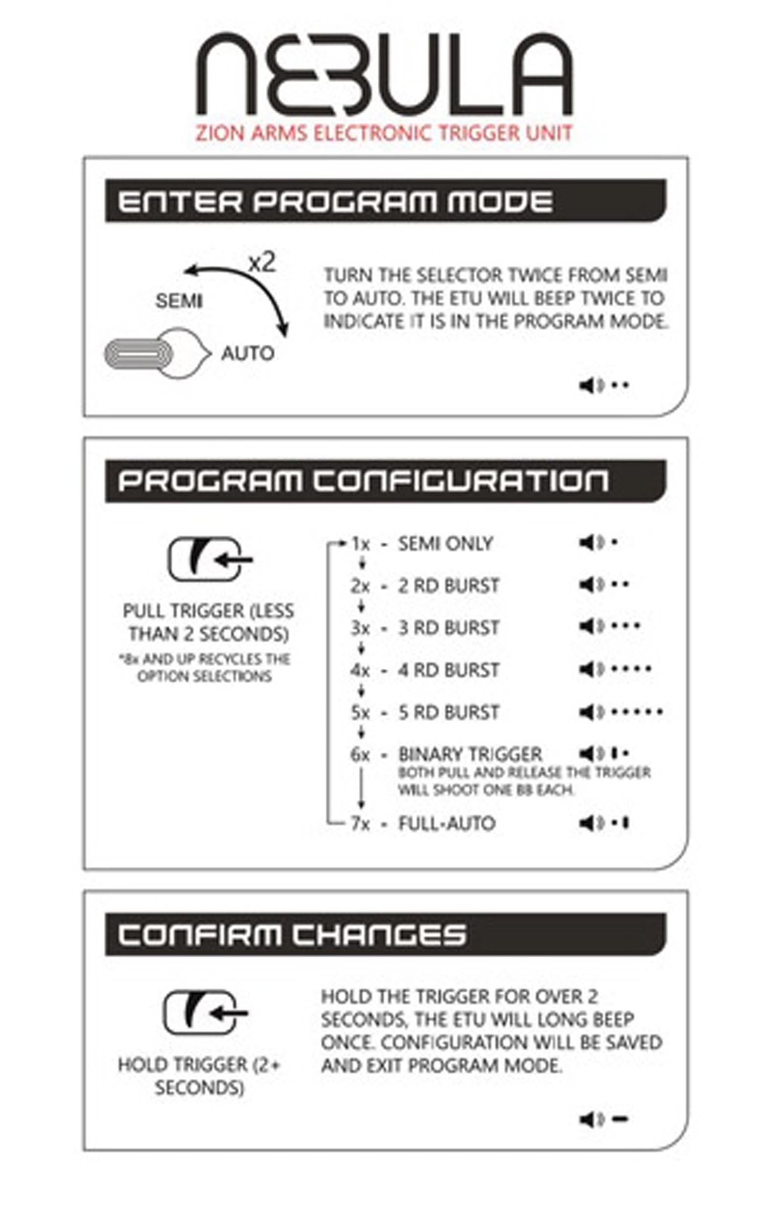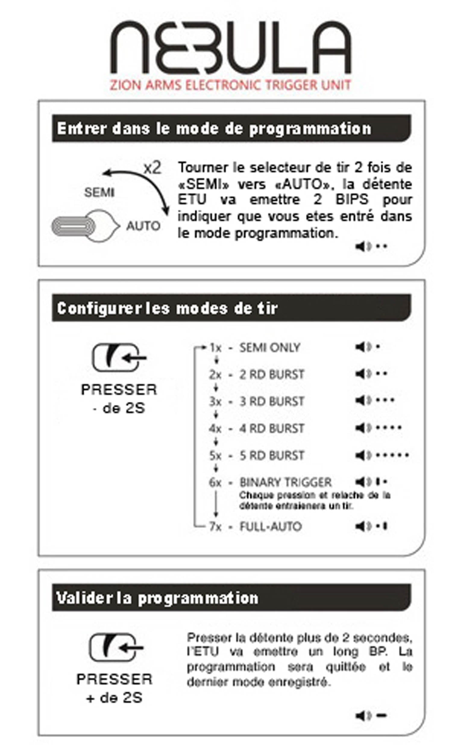 Thanks to its new Nebula V2 ZION Arms electronic trigger with magnetic sensor, this replica is extremely regular when firing (difference of 2-3 fps on average) and generates a rate of fire of between 23 and 25 rounds per second (depending on the battery used), with several firing modes: semi, semi only, full auto, burst 2-3-4-5 shots and binary!